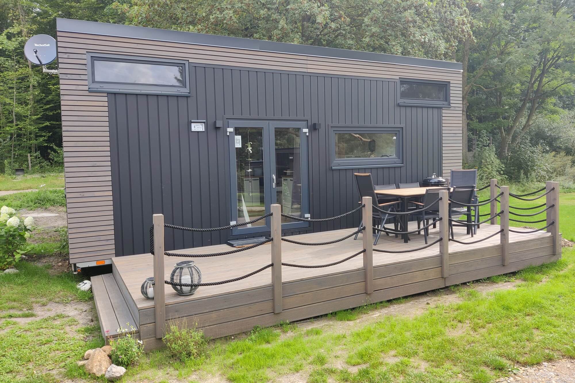 Das Tiny House 32 - Hameln ist das zweite Haus auf der dritten Ebene und liegt am Rand der Tiny House Anlage mit schöner Terrasse in erhöhter Lage.